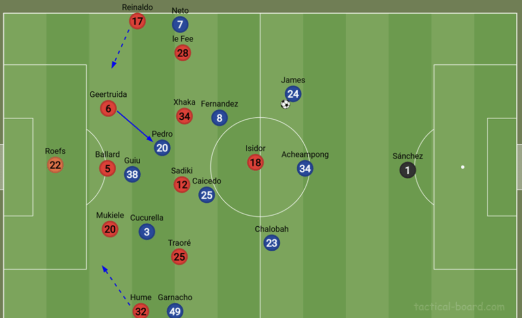Towards the end, le Bris substituted his entire front three who battled hard in maintaining their shape and catching Chelsea on the counter for the fresh legs of Chris Rigg, Brian Brobbey and Chemsdine Talbi. The final two combined for the winner with Geertruida ironically playing a crucial role considering he was brought in as a defensive choice. The Dutchman carried the ball out of Sunderland’s penalty area before launching a long ball for Brobbey to hold up against Tosin Adarabioyo and Trevor Chalobah. Not content with his pass, Geertruida powered forward and as Brobbey held the ball well, the Dutchman’s run dragged his marker Reece James out of the way to open space for Talbi to calmly win the game.